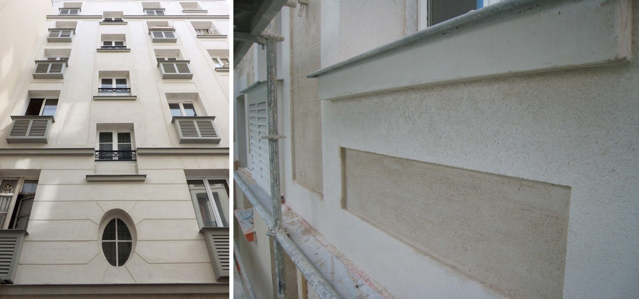 Cette rénovation a nettement amélioré le confort et réduit les charges des habitants d’un petit îlot situé dans un quartier dense du 14e arrondissement de Paris. L’opération comprenait le ravalement des façades sur cour des deux immeubles et une isolation par l’extérieur en chaux-chanvre, qui a réduit les déperditions thermiques de plus de 50 %. Le chantier en site occupé fut un premier défi. L’autre challenge était la présence de frises colorées, corniches et garde-mangers, qui donnaient à cette rénovation une dimension patrimoniale. Le chantier s’est déroulé en plusieurs phases : moulage des modénatures existantes, reprise complète de ces modénatures et des enduits, mise en œuvre d’un gobetis et d’un corps d’enduit isolant en chaux-chanvre (8 cm), application d’un second enduit chaux-chanvre et fixation de goujons en inox pour le scellement des modénatures, finition en chaux-sable avec reproduction des anciennes modénatures. L’isolation par l’extérieur en chaux-chanvre est particulièrement pertinente dans le contexte parisien : le très bon rapport poids/performance permet d’équilibrer le budget, car il évite des reprises structurelles dans un quartier au sous-sol creusé de catacombes et d’anciennes carrières.