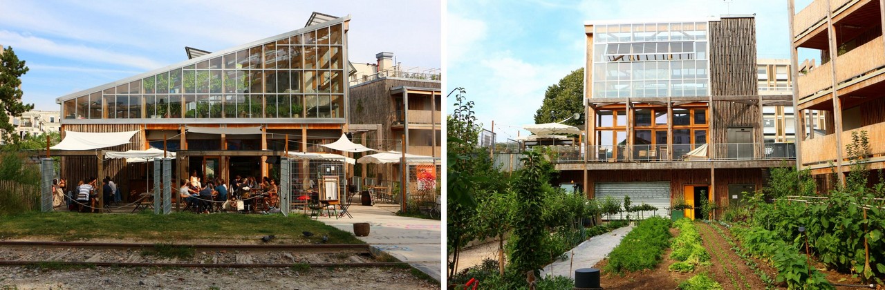 La Ferme du Rail est un lieu de vie et de formation réalisé dans le cadre de l’appel à projets Réinventer Paris 1, lancé par la Ville en 2014. Cette opération militante, initiée par des habitants et associations du 19e arrondissement, prouve qu’un autre mode de vie est possible, même dans une métropole. Son modèle économique écoresponsable, fondé sur les circuits courts, allie maraîchage urbain et solidarité afin de générer une activité agricole créatrice d’emploi. Deux constructions en bois isolées en paille encadrent le potager. À l’ouest, la résidence héberge 15 personnes en insertion et 5 étudiants en horticulture. Au nord, le bâtiment d’exploitation regroupe une grande serre, des ateliers, une champignonnière et un restaurant. Les clients y dégustent les fruits et légumes produits sur le site et ceux d’agriculteurs partenaires. La Ferme du Rail fournit aussi plusieurs services : collecte et traitement des déchets organiques, service d’entretien des espaces verts, organisation d’ateliers et de manifestations, etc. En accueillant tous les publics pour une initiation à de nouvelles formes d’agriculture et d’alimentation, cet équipement de quartier suscite réflexions et échanges sur la place à donner à la nature en ville. Frugal, joyeux et créatif, le projet commence à faire des émules…