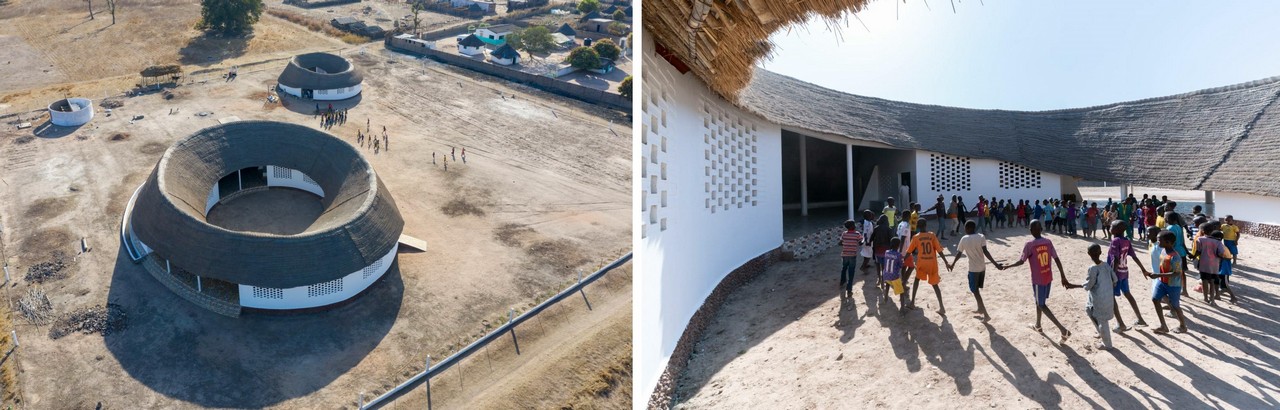 Le succès du centre culturel Thread, réalisé en 2016 au Sénégal, a conduit la même équipe à construire à proximité une école primaire associant un enseignement laïque et l’éducation traditionnelle coranique, selon un modèle inédit qui pourrait être importé dans d’autres régions du pays. Le projet réunit sous un même toit 300 élèves appartenant à différents groupes ethniques. Inspiré par une typologie vernaculaire, le bâtiment principal se compose de quatre salles de classe et de deux espaces flexibles, disposés en anneau autour d’une cour intérieure, convertie en lieu de spectacle et de rassemblement au service d’une communauté regroupant une centaine de villages. Les enseignants sont logés dans une annexe construite sur le même principe. Le choix de matériaux traditionnels enracine le projet dans cette zone reculée de l’est du pays. Leur mise en œuvre par des ouvriers locaux garantit l’appropriation du bâtiment par les habitants et son entretien. Au-dessus des murs en briques de terre crue fabriqués par les villageois, la charpente est composée de trois couches de bambous assemblés par des liens végétaux selon une technique japonaise. La couverture en chaume, inclinée à 45 degrés, guide les précipitations vers un canal qui entoure le bâtiment, afin de fournir de l’eau potable et d’arroser les jardins potagers gérés par un collectif de femmes.