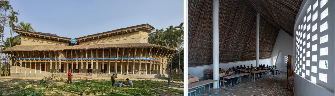 Anandaloy est au cœur de Rudrapur, un village situé au nord du Bangladesh. La rampe qui s’enroule autour du bâtiment occupe le devant de la scène pour montrer aux personnes handicapées qu’il leur est dédié. Dans l’atelier de l’étage, des femmes du village cousent les vêtements, sacs et coussins distribués par le label équitable Dipdii Textiles, créé par l’architecte Anna Heringer. Les constructions en terre et en fibres végétales ont, pour l’architecte allemande, « un énorme potentiel pour atténuer les problèmes majeurs de notre époque : changement climatique et pauvreté ». La majeure partie du budget de construction a profité à la communauté. Le bambou a été acheté aux agriculteurs locaux, et le chantier, entièrement réalisé à la main, a apporté du travail à une population souvent désœuvrée. Le mélange de boue et de paille des murs en bauge a été déposé couche par couche sur le soubassement en briques, puis arasé à la bêche. L’absence de coffrage autorisant des formes souples, le projet explore les capacités plastiques de la terre. Le bâtiment en retire une identité forte qui célèbre la diversité et la fantaisie. Tout en courbes, Anandaloy danse et mérite son nom : « lieu de joie » en bangladais.