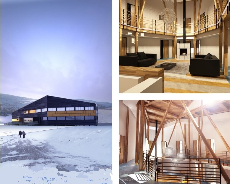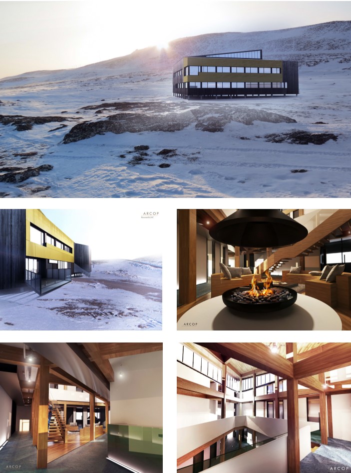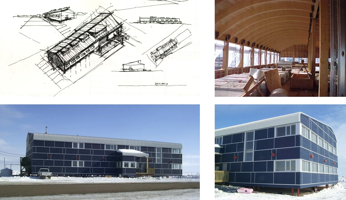 Le concept a été fortement influencé par des considérations relatives aux vues, à l’orientation du soleil arctique et aux vents dominants intenses. Le bois a été sélectionné pour ses qualités esthétiques, sa facilité de manipulation et ses caractéristiques de performance thermique. La technologie de la charpente en bois lourd est utilisée. Le projet a été réalisé selon la méthode de construction accélérée.