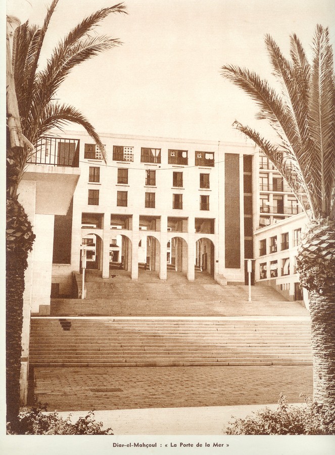La place de la Porte de la mer demeure le « clou du spectacle » des cités. Elle s’ouvre sur la baie d’Alger en une suite d’arcades installées devant un emmarchement et un vaste parvis. En plus d’offrir un cadre sur la mer, l’ensemble rappelle les arcades aveugles de la citadelle de la Casbah, et chaque arcade représente une porte de cité. L’architecte a habilement joué avec ces référents de baies architecturales. Photo : Tirée du site de Pierre Chatail (http://diaressaada.alger.free.fr/)
