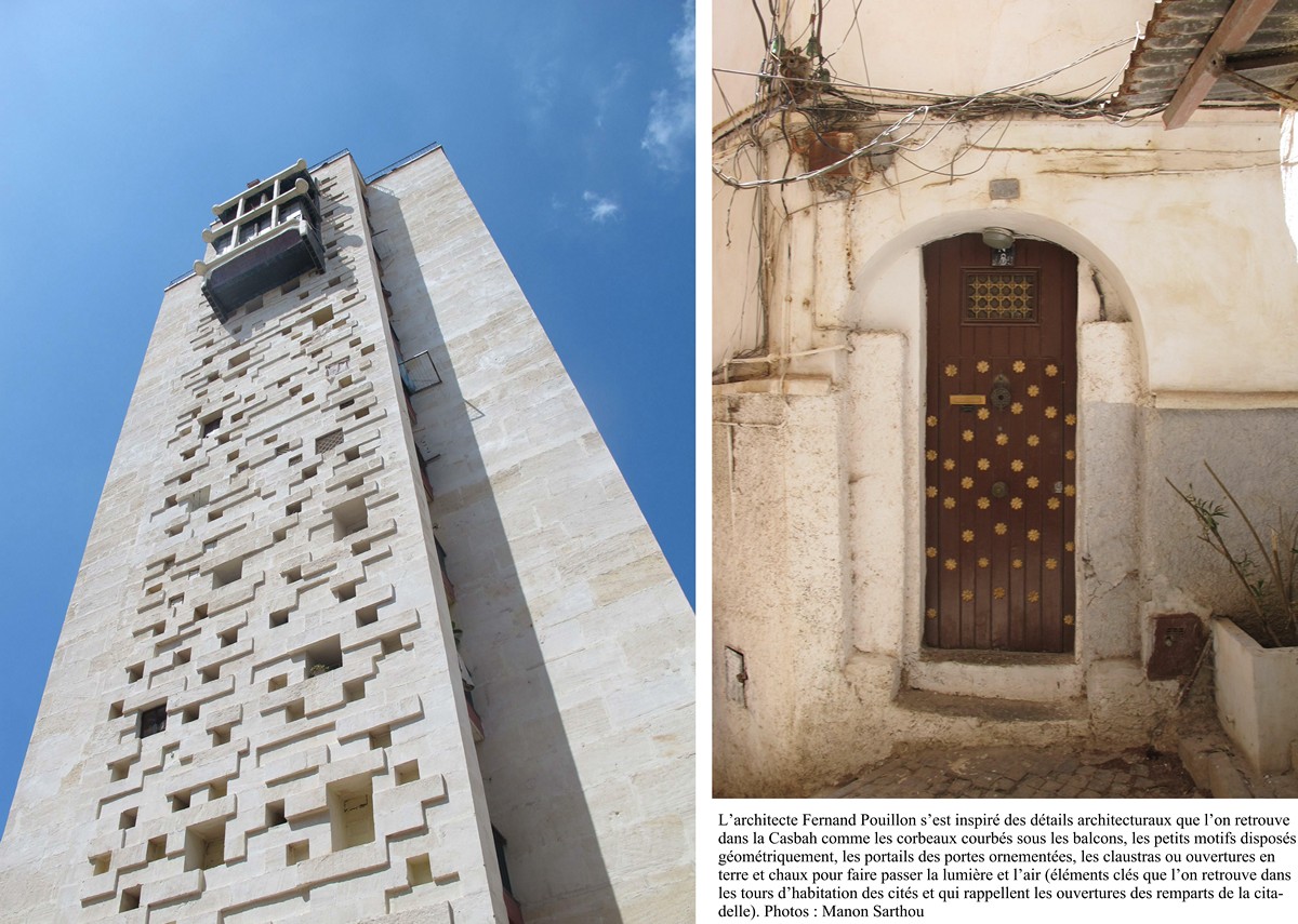 L’architecte Fernand Pouillon a réinterprété certains détails architecturaux et motifs géométriques de la casbah d’Alger pour les inscrire dans l’architecture moderne des cités. Par exemple, il a reproduit en plus grand sur les balcons des appartements les corbeaux en bois que l’on trouvait jadis sous les balcons en saillie typiques de la Casbah. Il a repositionné les petits percements carrés de la citadelle de la Casbah en colonnes sur les tours des cités pour faire entrer la lumière dans les cages d’escalier. Il a également fait dessiner, sur le sol des nouvelles places publiques des cités ou sous forme de fresques murales, les mosaïques géométriques que l’on trouvait dans les palais des deys (titre attribué au régent d’Alger au XVIIe siècle).