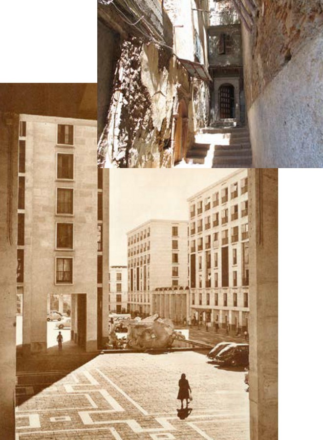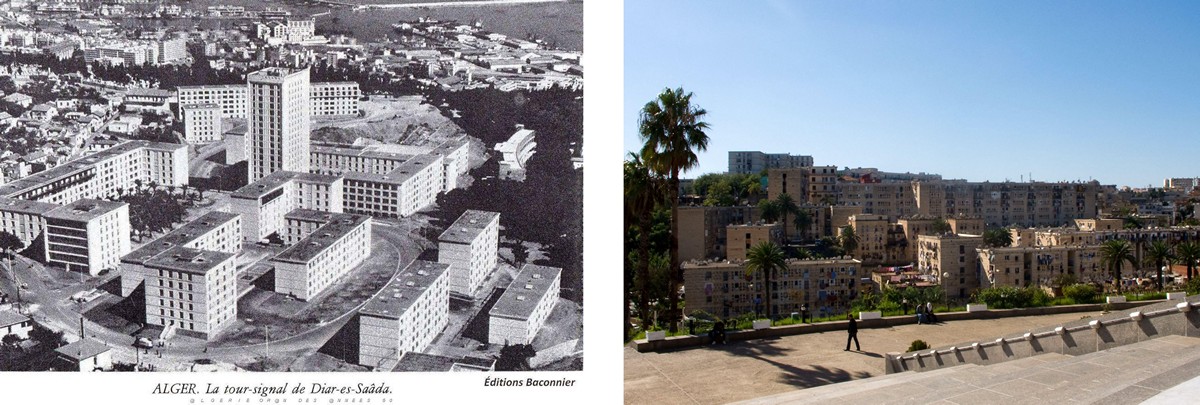 Plan au sol et photo en axonométrie de l’ensemble des cités Es Saada et El Mahçoul vers 1955. On comprend l’implantation des bâtiments aux formes géométriques diverses en L, en I, en U, en rectangle et en carré. La photo récente des ensembles d’habitation permet de voir que les bâtiments profitent du relief de la crête. La pierre blanche de Fontvieille est fort bien préservée, malgré le manque d’entretien des ensembles urbains (Plans et photos sépia : site de Pierre Chatail (http://diaressaada.alger.free.fr/), photo récente : Manon Sarthou).