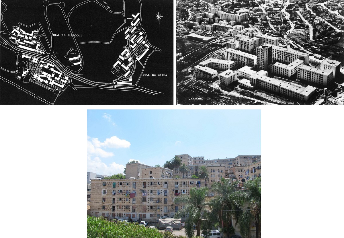 Diar Es Saada, édifiée en 1953, comptait alors 800 logements. Diar El Mahçoul, construite l’année suivante en, accueillait 1 800. En arpentant les deux cités, nous avons pu comparer le projet théorique de base, sa réalisation initiale et son état actuel. Bien qu’abîmées, notamment à cause du manque de réglementation urbanistique et du problème criant de surpopulation urbaine4, elles révèlent toujours la volonté commune de l’architecte Pouillon et de Jacques Chevallier, maire d’Alger de 1953 à 1958, de résoudre le problème de pénurie de logements d’après-guerre tout en tentant d’éliminer les bidonvilles qui se développaient sur les hauteurs de la ville.