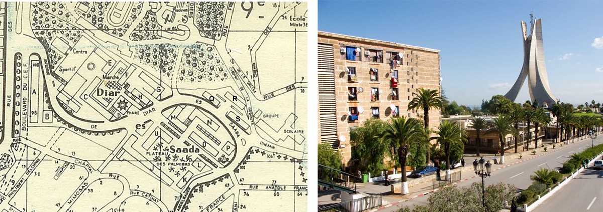 Axes majeurs des rues et boulevards de Diar Es Saada vus en plan au sol. Les cités sont séparées par le grand boulevard d’où l’on peut admirer le mémorial du Martyr, icône contemporaine d’Alger. Il a été érigé par la société québécoise Lavalin en 1982 selon une maquette créée à l’École supérieure des beaux-arts d’Alger. Conçu en trois palmes stylisées de béton s’élançant jusqu’à hauteur de 92 mètres, il exprime la culture, l’agriculture et l’industrie algérienne. Source plan : http://diaressaada.alger.free.fr/, photo : Poudou99_Wikipédia