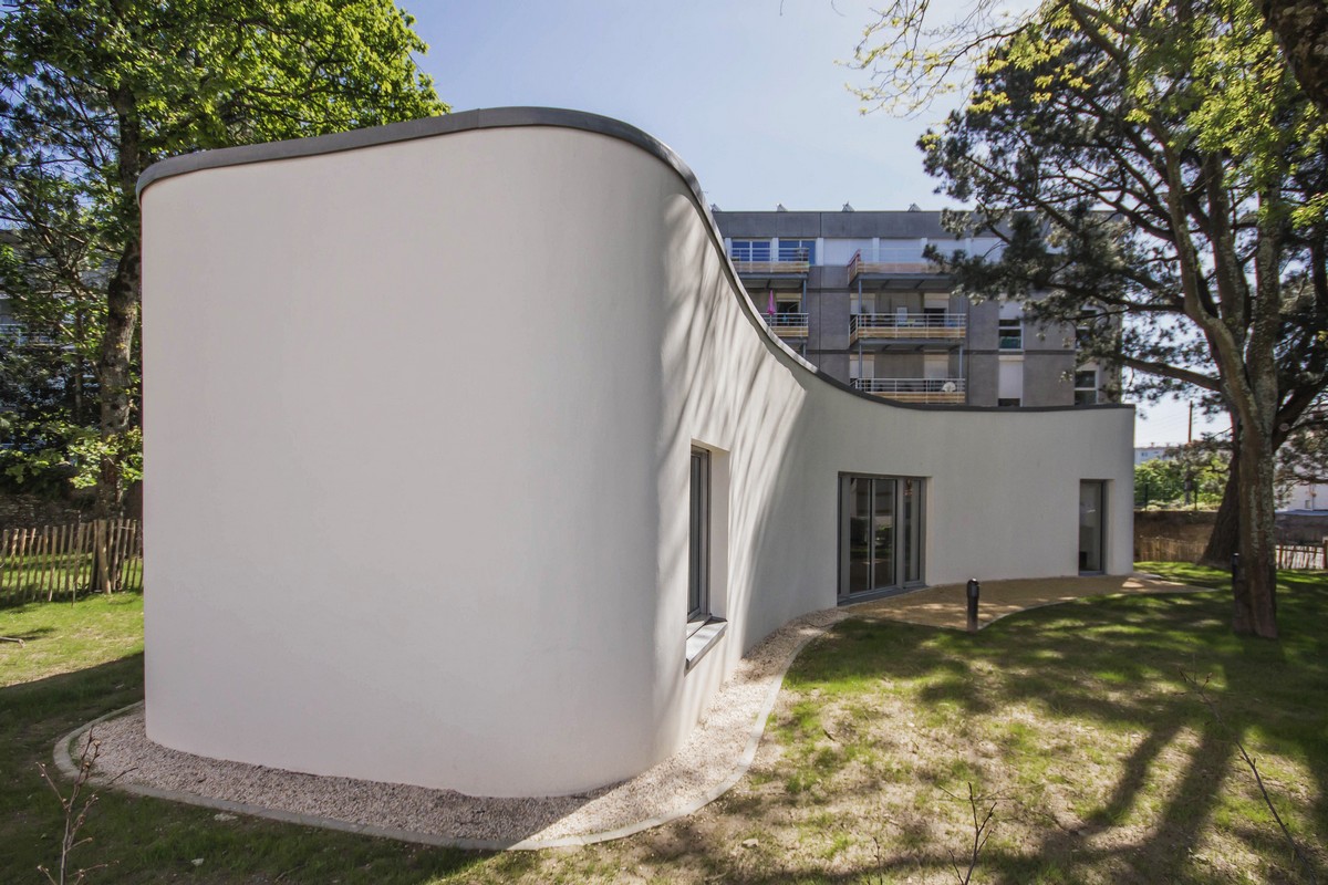 Afin de conserver 100 % de la canopée en présence et d’imbriquer au mieux bâti et paysage, l’architecte a d’abord fait appel au Service des Espaces verts et de l’Environnement de la Ville de Nantes, avec qui il a cartographié le réseau racinaire des arbres. Cet exercice a permis de déterminer les points les plus propices pour marquer les contours de la maison, dont découle la forme de Y, bien visible du ciel. À hauteur d’humain, ce sont surtout les courbes qui donnent à Yhnova sa personnalité : le robot mis au défi par l’architecte s’est effectivement acquitté de sa tâche de monter des murs de 4 mètres de haut tout en courbes et percés de plusieurs ouvertures, 165 m 2 d’élévation au total.