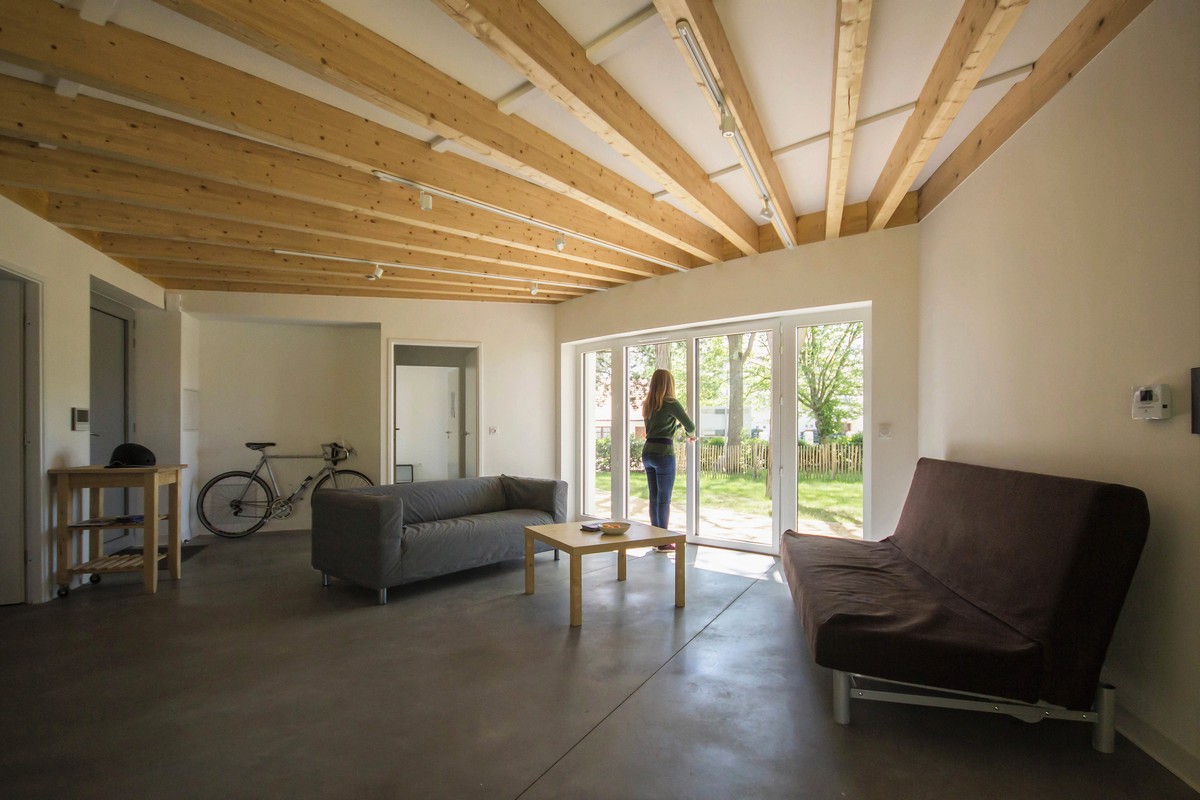 L’intérieur de l’habitat est conçu en trois mini unités disposées de façon rayonnante autour d’un espace central faisant office de séjour. Chacune des unités est constituée d’une ou deux chambres et d’un espace servant – salle de bain, cuisine ou cellier. Photo : TICA architectes & urbanistes + Corentin Schieb