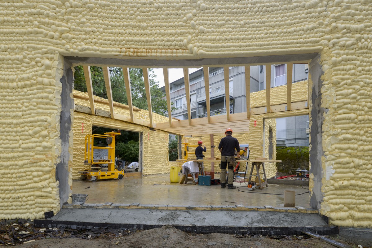 L’élévation des murs terminée, le robot est ressorti de l’habitation par un cadre de porte prêt à recevoir la menuiserie. La mousse a été laissée en place pour procurer l’isolation intérieure et extérieure sans pont thermique de la maison. Les travaux de second œuvre se sont déroulés en mode traditionnel pendant trois mois.