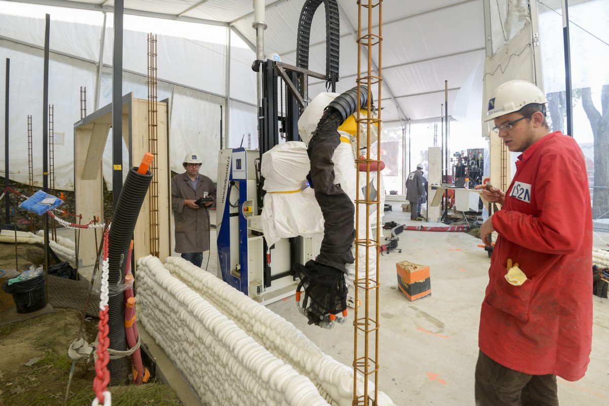 Comment a travaillé ce « robot- maçon » ? Monté sur un véhicule guidé automatisé – ses « jambes » –, le robot était guidé par un capteur laser à partir de la maquette numérique de l’habitat. C’est une opératrice munie d’un joystick qui contrôlait son bras polyarticulé, du bout duquel une tête d’impression injectait en couches successives trois parois de matériaux : deux parois parallèles de mousse polyuréthane expansive servant, dès que durcies, de coffrage à une paroi de béton structurant.