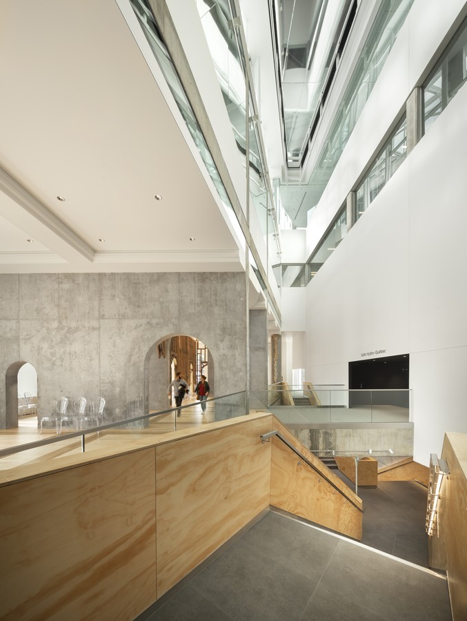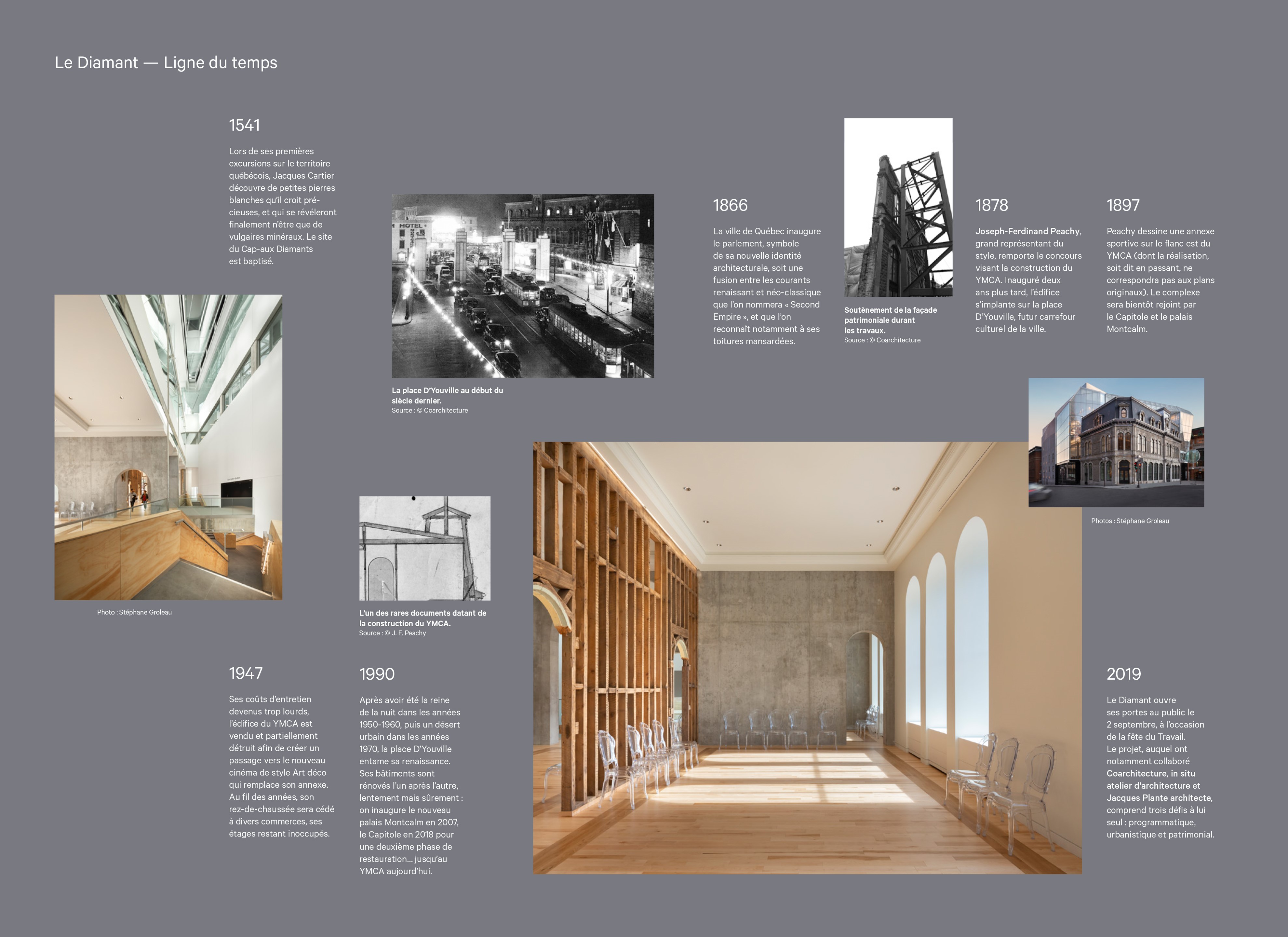 Côté extension, enfin, un travail est mené en étroite collaboration avec les ingénieurs mécaniques (Dupras Ledoux/Ambioner), de façon à intégrer les paramètres énergétiques à la conception de la nouvelle enveloppe de verre. Son profil en facettes résulte ainsi d’études poussées sur l’exposition solaire, et l’intégration d’une sérigraphie, outre l’aspect esthétique, assure le contrôle thermique des espaces intérieurs. Miroir le jour, Le Diamant s’illumine de mille feux les soirs de spectacle, dessinant une toile de fond à l’édifice historique de l’ancien YMCA. Jacques Cartier tient enfin son trésor !