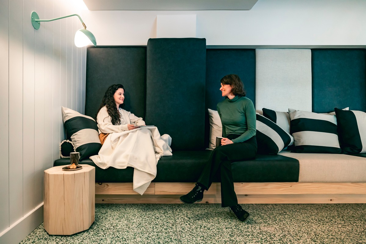 Le Vivoir n’est pas seulement un lieu de restauration, mais aussi un lieu de détente et d’échange, comme l’y invite l’ambiance feutrée de l’alcôve. On remarque le travail du designer Christopher Storrar pour marier le plancher de terrazzo des années 1950, les coussins noir et blanc aux couleurs des Augustines, le bois brut du billot et les lambris en écho au terroir, ainsi que le design contemporain de la lampe. – Photo : André-Olivier Lyra.