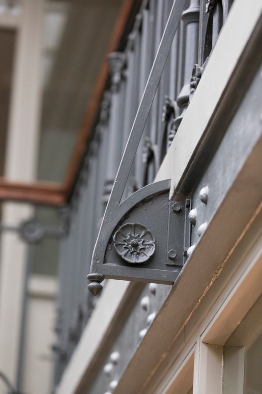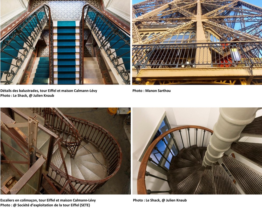 Des similitudes se retrouvent dans plusieurs éléments de construction de la tour Eiffel et de l’ancienne maison d’édition Calmann-Lévy. Elles concernent notamment les escaliers en colimaçon, les balustrades, les poutres de fer fixées avec des boulons. Tous ces éléments ont été conçus dans les ateliers Eiffel à Levallois-Perret à la fin du XIXe siècle avant l’Exposition universelle de 1889. – Photo : Le Shack, @ Julien Knaub