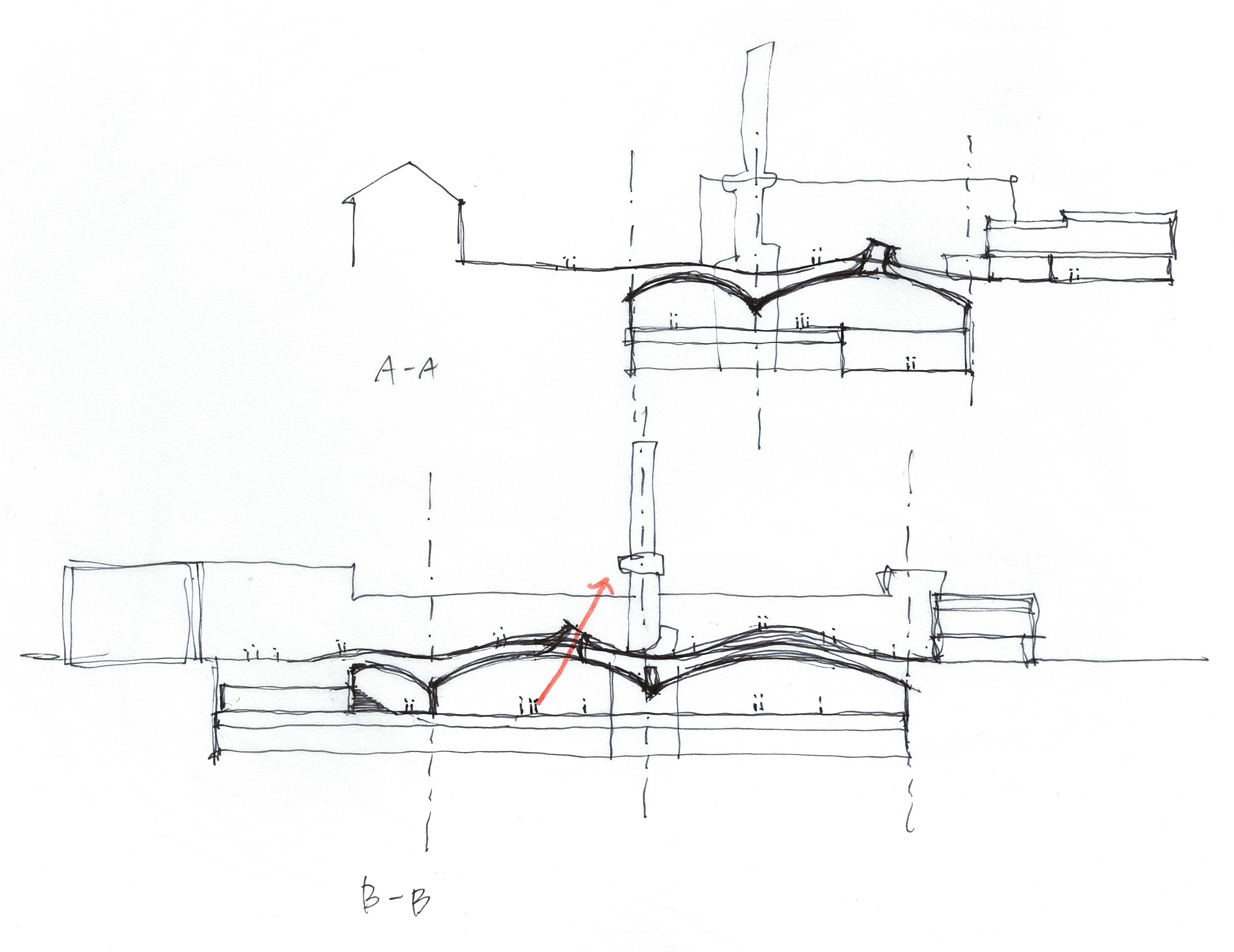 Croquis du projet du musée Amos Rex esquissant les dômes émergeant dans la cour du site Lasipalatsi et les voûtes des plafonds en souterrain.