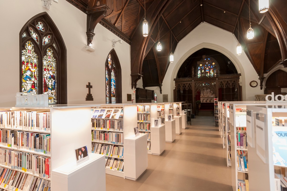 Vue intérieure de la bibliothèque Claire-Martin (ancienne église Saint-Matthew), rue Saint-Jean à Québec. – Photo : Ville de Québec