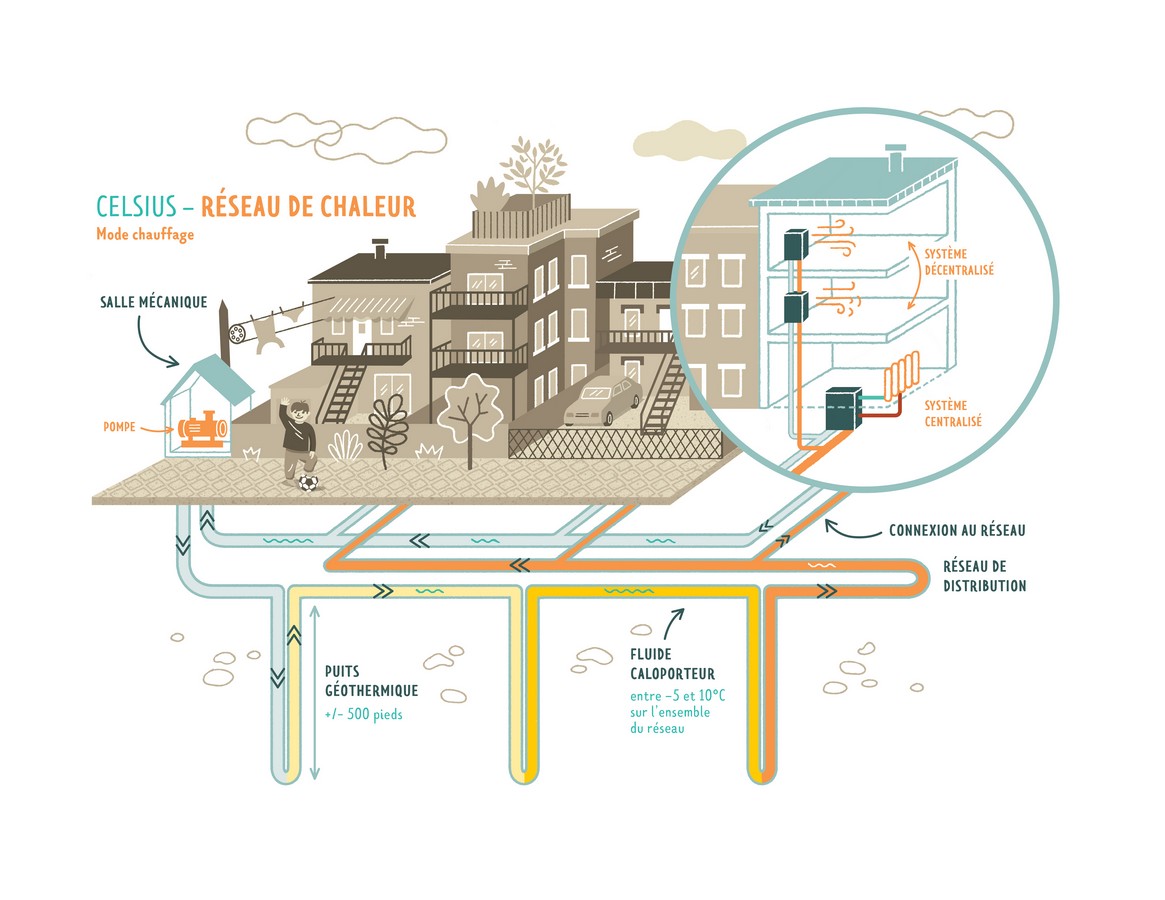 Techniquement, l’idée est de mutualiser un champ de puits géothermiques creusés sous la ruelle. De là, un réseau de distribution souterrain achemine le fluide caloporteur à chaque résidence, où une thermopompe donnera au résident le contrôle de la température de son appartement. Le fluide qui circule dans le réseau souterrain n’est donc pas encore chauffé, ce qui limite les pertes de chaleur.
