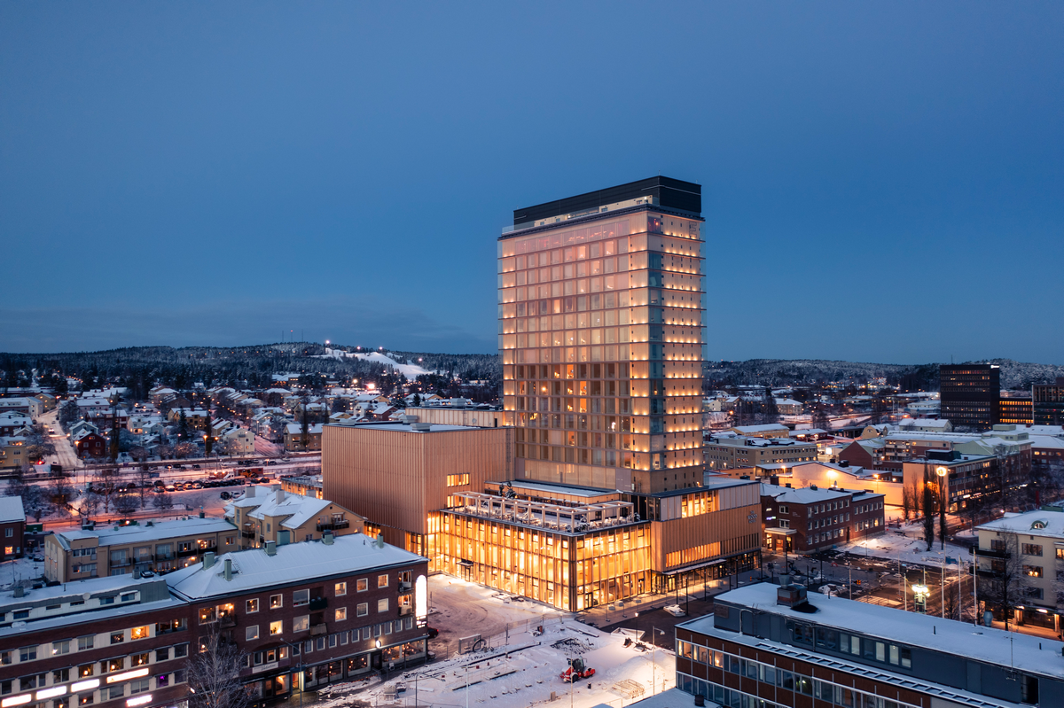 Le Sara Cultural Centre à Skellefteå, Suède. Réalisé par White Arkitekter, cet édifice de 20 étages comporte une structure entièrement en bois. Deux systèmes structuraux ont été développés : un pour le centre culturel et un pour l’hôtel s’élevant sur 20 étages. L’hôtel a été réalisé à l’aide de modules préfabriqués en bois lamellé-croisé empilés entre deux cages d’ascenseur également en CLT. Le centre culturel de plus faible hauteur a été construit avec une structure de poutres et colonnes en bois lamellé-collé avec des murs de cisaillement en CLT. – Source : Visit Skellefteå