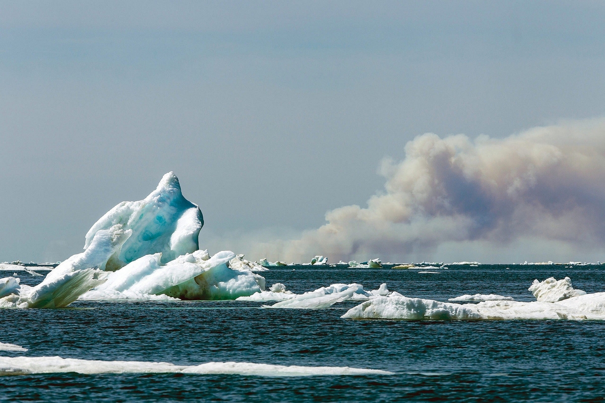 MANITOBA – 2023 : La fumée des incendies de forêt accélère la fonte des glaces de mer dans la baie d’Hudson. Les incendies de forêt au Canada ont commencé à accélérer la fonte des glaces grâce à une boucle de rétroaction : la suie, dérivée des incendies, se dépose à la surface de la glace et l’assombrit, l’amenant à absorber davantage de chaleur. – Photo : Paul Souders/Getty Images