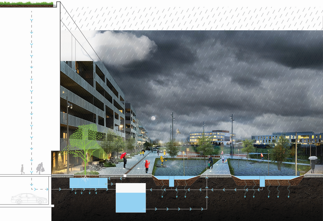Illustration du fonctionnement de l’infrastructure verte permettant la gestion des eaux de pluie à travers les bassins de rétention végétalisée. – Source : © NIPPAYSAGE