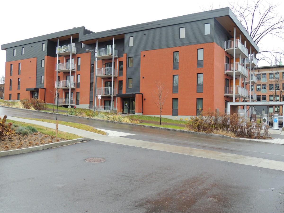 La Cité verte est peut-être le premier quartier à prétention environnementale à être sorti de terre à Québec. Dans ce quartier, construit en 2015, Les Habitations Trentino sont un complexe de 40 logements sociaux, dont la construction a été mandatée par la Société d’habitation du Québec (SHQ) qui voulait démontrer la rentabilité d’un bâtiment à faible consommation énergétique. Sans viser la certification Passivhaus, les concepteurs s’en sont inspirés. Brièvement, le bâtiment est compact. La résistance thermique des murs est de 6,5 (RSI) et celle des fenêtres est de 0,87 (RSI) grâce à un triple vitrage. Le taux de renouvellement d’air est de 0,6 à l’heure. Un mur solaire préchauffe l’air extérieur durant la saison froide. Le chauffage est fourni par la centrale à la biomasse qui alimente toute la Cité verte. Les simulations du bâtiment avec le logiciel Passive House Planning Package (PHPP) prévoyaient une consommation de chauffage de 16,6 kWh/m2a, juste au-dessus des 15 kWh/m2a requis pour la certification. Autre mesure environnementale, le bâtiment est en bois. En fait, il s’agit d’un jumelé puisqu’il est composé de deux parties identiques de 20 logements chacune, l’une en ossature légère et l’autre en CLT. L’objectif était de comparer les deux systèmes constructifs en matière de performance énergétique.
