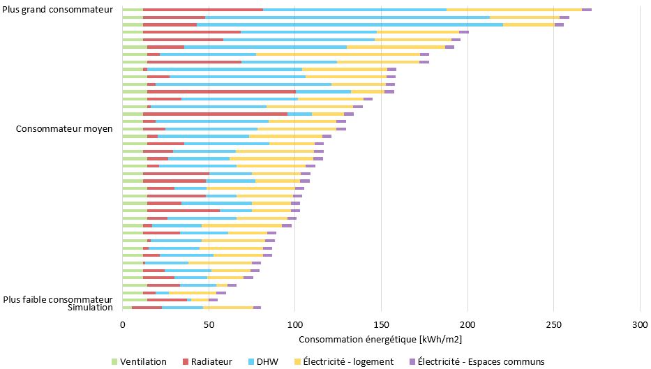 L’idée n’est toutefois pas d’accuser les occupants de cette contre-performance énergétique, mais de mieux tenir compte de leur comportement dans les simulations. Jean Rouleau s’est alors attelé à les modéliser. L’approche classique attribue à chaque occupant un comportement typique : il est présent dans son appartement du soir au lendemain matin, prend une douche par jour… Cette approximation simpliste qui suppose une homogénéité des comportements est bien loin de la réalité. Or, des écarts de comportements se traduisent par des écarts de consommation par rapport aux simulations. Jean Rouleau a plutôt adopté une approche statistique basée sur des modèles probabilistes du comportement d’ouverture des fenêtres, de la durée des douches, des températures de consigne… En assemblant ces modèles, il a produit un modèle centralisé du comportement des occupants et procédé à de nouvelles simulations du bâtiment. Et là, la consommation simulée varie grandement selon les comportements, comme observé dans le bâtiment. La suite serait de concevoir un bâtiment en s’appuyant sur des simulations qui tiennent compte du comportement des occupants, autrement dit à adapter le bâtiment aux occupants.
