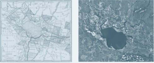Carte du lac Saint-Jean en 1908 et photo aérienne en 2018. Ces images illustrent les terres de la Couronne et les diverses municipalités avant et après le débordement de 1926. On peut noter l’agrandissement du littoral du lac du côté de Métabetchouan, autrefois appelée Saint-Jérôme – Source : Carte, 1908, Université du Québec à Chicoutimi ; Photo aérienne, 2018, GoogleMaps.