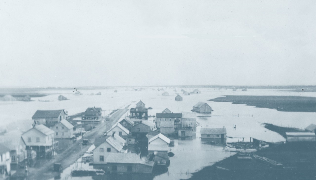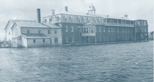 L’Hôtel-Dieu Saint-Michel à Roberval lors de la crue des eaux en mai 1928. L’évacuation des malades fut envisagée – Source : Société historique du Saguenay, SHS-P002, S7, P03206-01