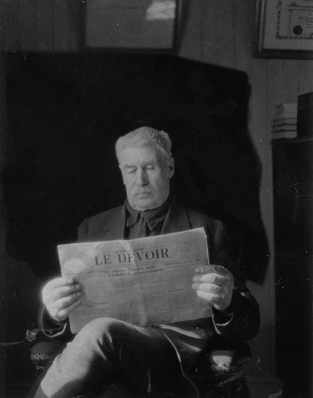 Onésime Tremblay lisant Le Devoir vers 1928. Ce visionnaire luttait non seulement contre la corruption politique, mais également pour la préservation d’une agriculture en harmonie avec l’environnement. En 1932 et 1933, il écrit une série d’articles publiés dans Le Bulletin des agriculteurssur ce qu’il a appelé « l’affaire du Lac-Saint-Jean », en se mettant notamment dans la peau d’un cultivateur lésé :
