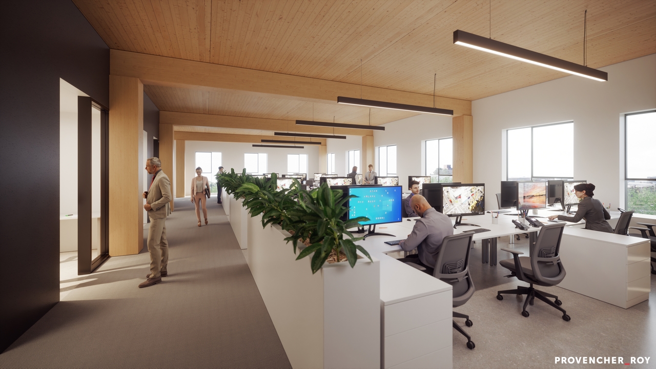 L’utilisation d’une structure 100 % en bois est une première pour la Société de développement Angus, qui ne compte pas s’arrêter là. En plus de leur impact environnemental réduit, les poutres et colonnes en bois lamellé-collé laissées apparentes ainsi que le pontage en bois lamellé-croisé contribueront également à créer des environnements intérieurs chaleureux qui seront bonifiés par des terrasses végétalisées et des vues sur le mont Royal. « L’idée n’était pas de faire un compromis : une structure en bois offre à la fois des espaces de travail chaleureux, confortables et écologiques », précise Sonia Gagné.