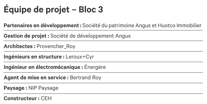 En jumelant innovation, développement durable et souci de l’expérience utilisateur, le Bloc 3 se raccorde ainsi parfaitement au reste du Technopôle Angus, tant dans son esprit que dans son implantation. « Oui, on voulait bâtir un bâtiment LEED et Carbone zéro, mais le défi était de ne pas en faire un insensible laboratoire opaque : on voulait concevoir un bâtiment avec une belle signature, un bâtiment vivant, optimisé, et qui se démarquerait aussi par son élégance », souligne Sonia Gagné. De quoi en faire une véritable locomotive pour l’avenir du bâtiment durable.