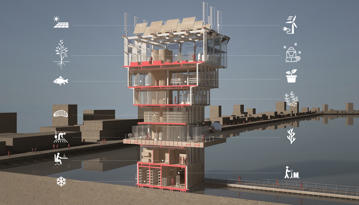 Faire fonctionner un tel édifice demande de l’alimenter énergétiquement et permettre son bon fonctionnement de jour comme de nuit. Grâce à la mise en place d’éoliennes et de panneaux solaires, c’est plusieurs kW/h qui pourront être produits quotidiennement pour alimenter les systèmes de production de chaleur et permettre la ventilation et l’éclairement des zones de production en intérieur.