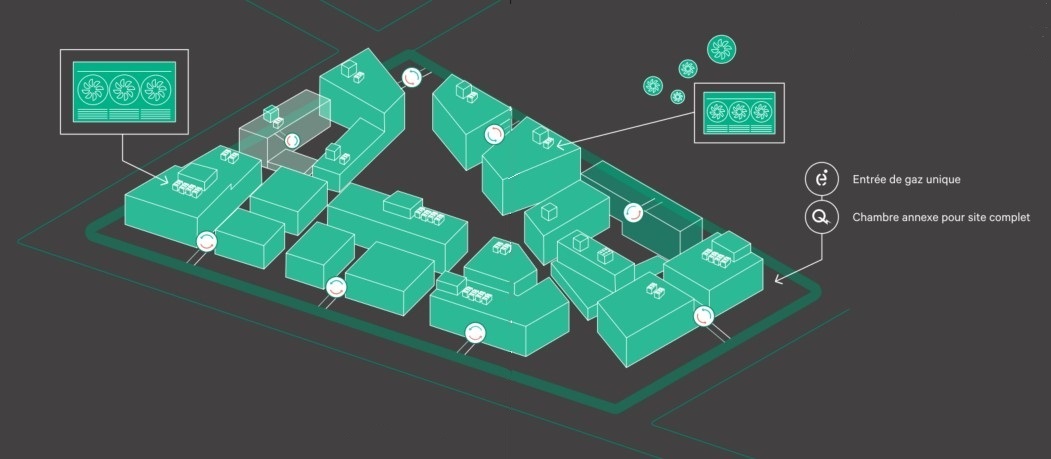 Vue schématique du concept de la boucle Angus à l’échelle du site. L’approvisionnement de la boucle énergétique sera apporté par des équipements d’aérothermie placés en toiture. Cette technologie de thermopompage aérothermique récupère l’énergie dans l’air ambiant et l’envoie dans une boucle d’eau mitigée, qui relie les différents bâtiments. – Source : Énergère