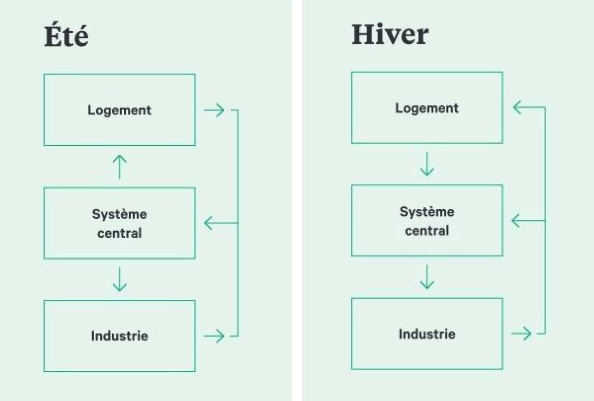 Exemple de boucle énergétique avec fonctions thermiques complémentaires selon les saisons. – Source : Marc-André Mc Donald