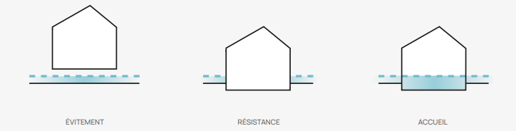 Trois stratégies d’adaptation des bâtiments aux inondations – Source : Architecture sans frontières Québec.