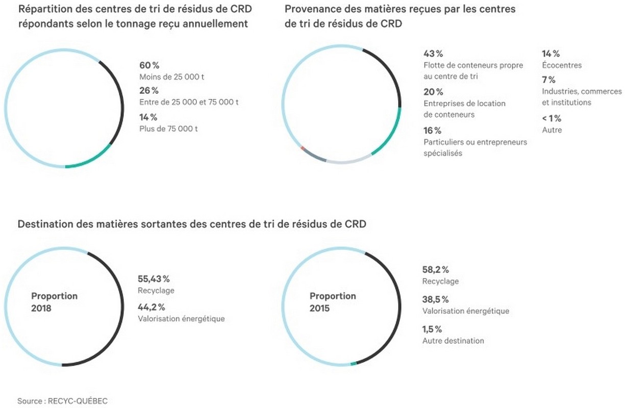 « Il se génère environ 3 millions de tonnes de résidus CRD chaque année au Québec, décrit Nicolas Bellerose. De ces 3 millions, 1,3 million de tonnes sont directement acheminées du chantier au lieu d’élimination et près de 1,7 million sont acheminées dans un centre de tri CRD. » Mais tout ce qui va au centre de tri n’est pas recyclé. Le Bilan 2018 de la gestion de la matière résiduelle au Québec indique que 53 % de la matière est recyclée ou envoyée en valorisation énergétique, tandis que 47 % est envoyée à l’élimination. Ces 47 % s’ajoutent aux résidus qui sont éliminés directement sans passer par un centre de tri. Malheureusement, depuis ce bilan de 2018, la situation ne semble pas s’être améliorée.