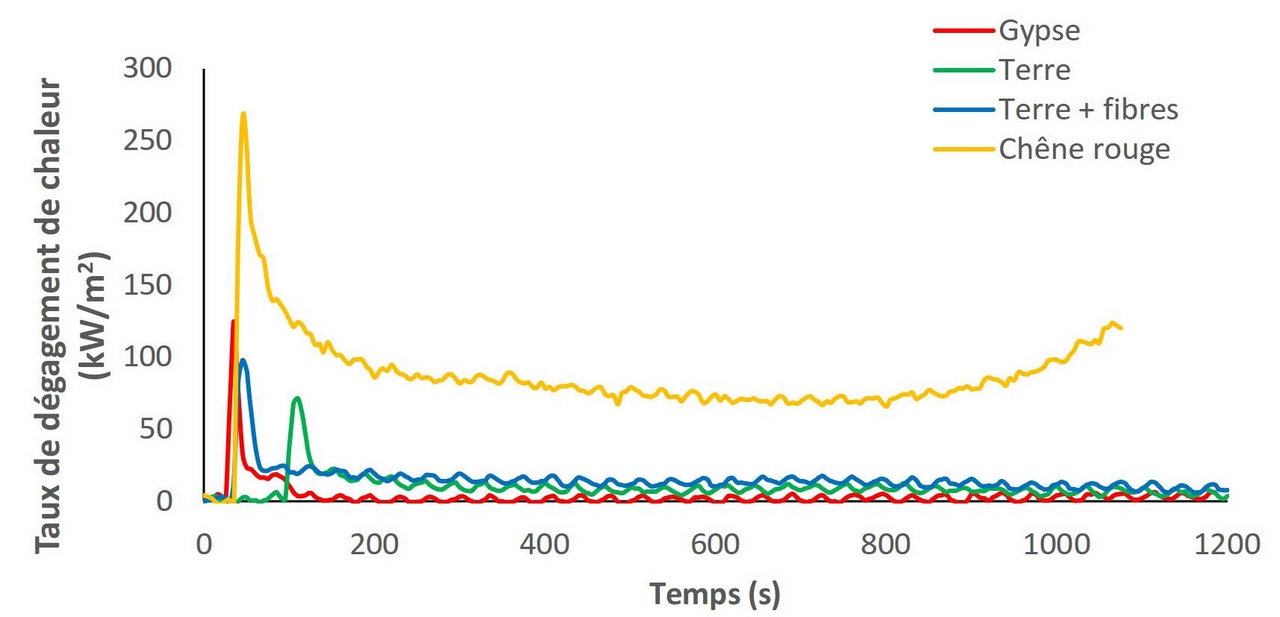 La résistance au feu des panneaux muraux est un élément crucial pour leur usage à l’intérieur des bâtiments. Le comportement au feu des panneaux à l’étude a été évalué à l’aide d’un calorimètre à cône en suivant la norme ISO 5660. Ces tests ont permis d’établir que les panneaux en terre crue se comportent de façon similaire à ceux en gypse face au feu. Ils présentent un taux de dégagement de chaleur (figure 1) juste légèrement supérieur dans le temps, mais avec un pic de chaleur plus faible lors de la combustion du papier.