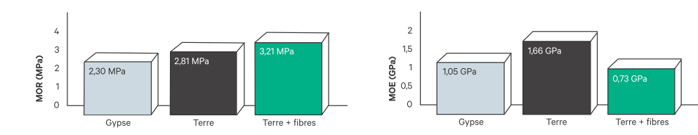 Les propriétés mécaniques sont également importantes pour faciliter la manipulation et l’usage de ces panneaux. Un test de flexion (figure 2) en trois points a permis d’établir certaines propriétés des panneaux, dont le module de rupture (MOR) et le module d’élasticité (MOE). Ces résultats ont montré que les panneaux à base de terre sont moins cassants que ceux à base de gypse, mais qu’ils sont aussi moins flexibles. L’ajout de fibres de bois a permis d’accroître encore davantage la résistance des panneaux de terre, mais aussi de leur apporter un peu de souplesse.