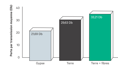 En ce qui a trait aux propriétés acoustiques, un test de perte par transmission (figure 3) a été effectué à des fréquences de 150 à 4200 Hz à l’aide d’un tube d’impédance. Cette propriété, qui indique l’atténuation des sons lorsqu’ils traversent un matériau, affecte directement l’isolation acoustique entre deux pièces adjacentes. Le test a permis d’établir que les panneaux en terre offrent une meilleure atténuation des sons que ceux en gypse, ce qui représente un avantage notable pour l’usage de ces matériaux dans le bâtiment.