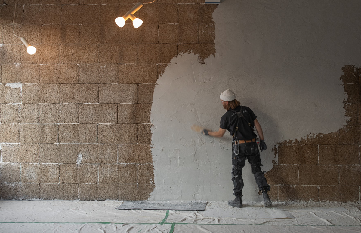 Anthony Néron applique une première couche de finition à la chaux sur le mur en blocs de béton de chanvre de l’Atelier DuChanvre à Sherbrooke. – Photo : Émilie Bergeron, DuChanvre