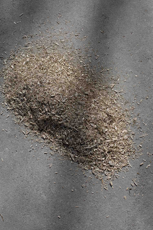 La chènevotte, partie ligneuse broyée des tiges de chanvre, constitue la biomasse utilisée pour le béton de chanvre, un excellent isolant thermique et acoustique. – Photo : Émilie Bergeron, DuChanvre