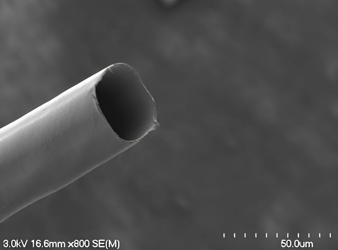 Structure creuse de la fibre d’asclépiade (observée au microscope électronique à balayage) – Source : Université de Sherbrooke.