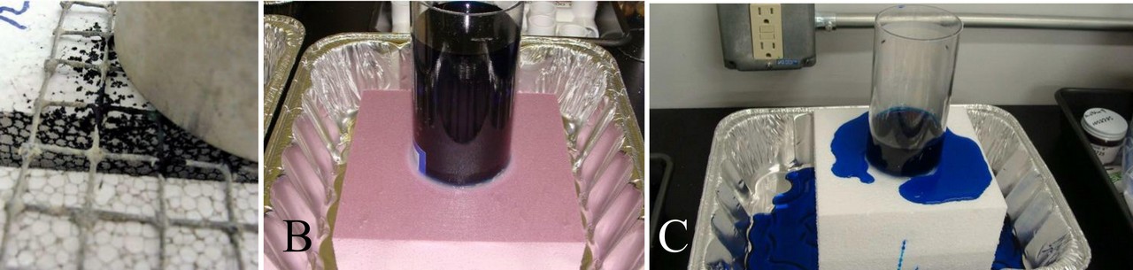 Figure 2 – (A) Dans le PSE, l’absorption capillaire d’une eau teintée avec un colorant hydrosoluble, de la surface inférieure vers la surface supérieure, suit les vides entre les billes de PSE. (B) Aucune fuite n’est observée dans le PSX en raison de la pression hydrostatique et de l’action capillaire. (C) Une fuite est observée dans le PSE en raison de l’action capillaire sous pression hydrostatique. Source : Owens Corning.