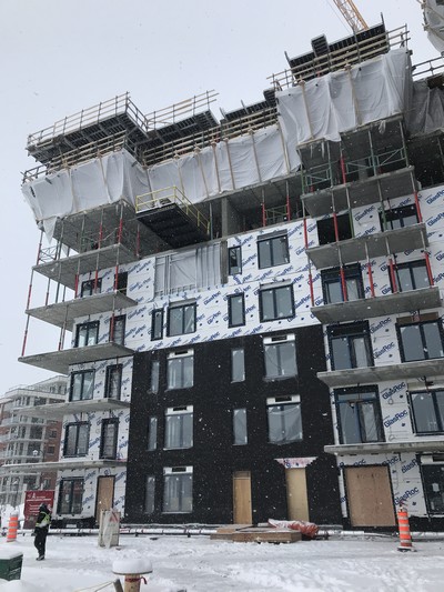 Pour certains projets de construction récents au Québec, les architectes et les entrepreneurs généraux impliqués ont fait exactement cela. Des projets tels que le Saint-Philippe, mené par l’architecte Bilodeau Baril Lemming et l’entrepreneur général Dinamo, le bâtiment Nicolas mené par Beaudet Faille Normand et Dinamo, et le bâtiment K mené par Alpha Architecture et Dalcon. Tous ces projets ont adopté une nouvelle méthode d’application de la mousse giclée où tout se fait de l’intérieur. Il n’est pas nécessaire de travailler à l’extérieur en hiver pour appliquer la mousse giclée.