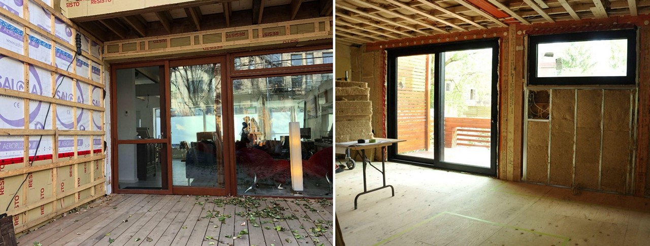 Détails de construction. Les projets Tricycle (à gauche) et Ahuntsic Réno (à droite) utilisent divers matériaux biosourcés, tels panneaux de bois, laine d’isolation en chanvre et membranes d’étanchéité d’air de la marque française SALOLA.