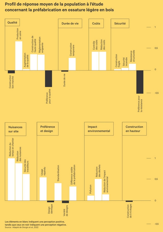 C’est notamment avec l’intention de répondre à ces questions que Baptiste Giorgio a entamé son projet de doctorat à l’Université Laval, au sein de deux programmations de recherche majeures sur la construction en bois, soit la Chaire industrielle de recherche sur la construction écoresponsable en bois (CIRCERB) et l’Initiative sur la construction industrialisée (ICI). Son projet de recherche avait pour but de caractériser les représentations sociales associées à la construction en bois massif et en ossature légère préfabriquée. Penchons-nous sur ce deuxième volet (Giorgio et al., 2022).