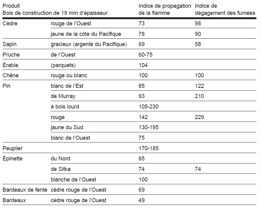 Par contre, à la différence des éléments structuraux, la notion de combustibilité du matériau (combustible ou incombustible) n’est pas la propriété intrinsèque principalement utilisée par le CNBC pour règlementer l’usage de ces revêtements intérieurs dans les bâtiments. Ce sont plutôt les concepts d’indice de propagation de la flamme (IPF) et d’indice de dégagement des fumées (IDF) qui servent de critères de performance incendie associés à l’utilisation des revêtements intérieurs de finition. De façon simplifiée, le premier a pour but de limiter la vitesse à laquelle un incendie peut se développer et potentiellement se propager à l’intérieur d’un bâtiment au-delà de son point d’origine, alors que le second vise à faciliter l’évacuation sécuritaire des occupants.