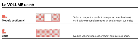 Ce sont surtout les modules volumétriques de type boîte qui permettent de maximiser la production usinée et de limiter le chantier à de simples raccordements entre modules et aux infrastructures. Évidemment, l’usine nécessite un investissement initial élevé, et donc une continuité de la demande afin d’amortir le tout.