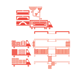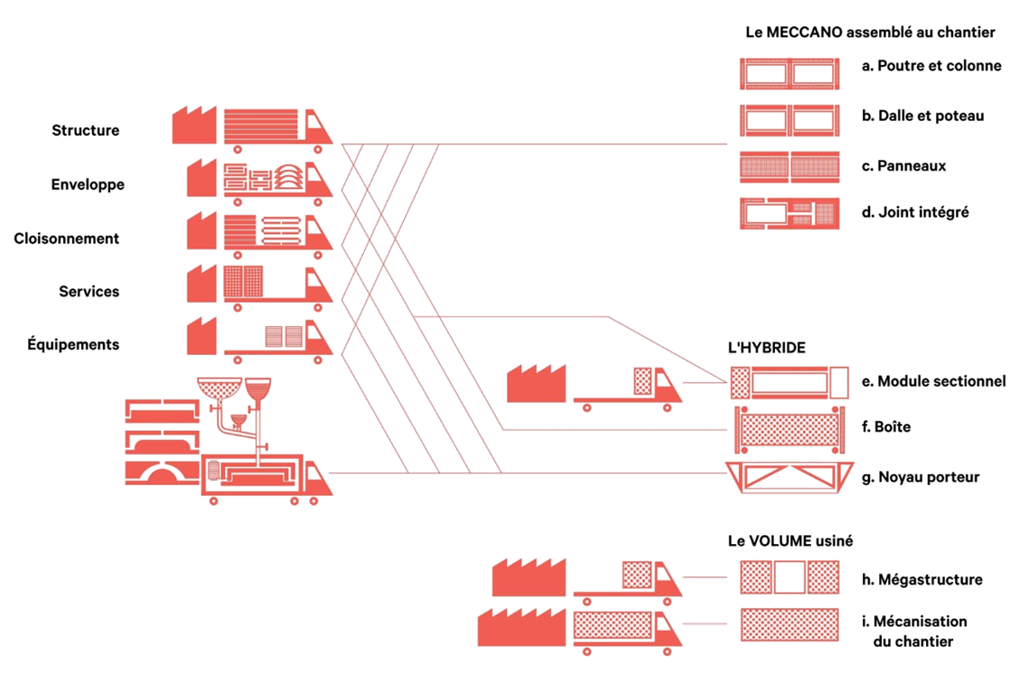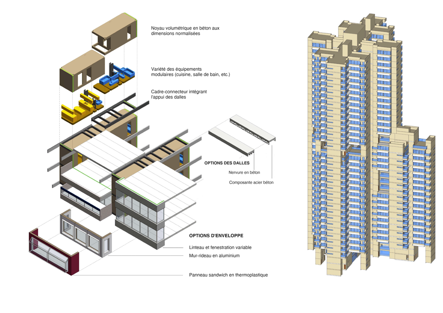 Le produit de l’industrialisation du bâtiment n’est généralement pas un bâtiment fini, mais plutôt un système constructif industrialisé (SCI) : un ensemble d’outils et de composants où les mêmes procédés et détails éprouvés sont configurés de façon à générer de multiples variations correspondant aux spécificités des occupants.