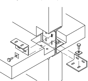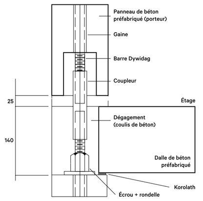 Enduits de lubrifiant, les boulons et fers angles à trous ovalisés du système Descon (Canada) sont nichés en retrait et protégés par un mortier ignifuge facile à concasser en cas de démontage.