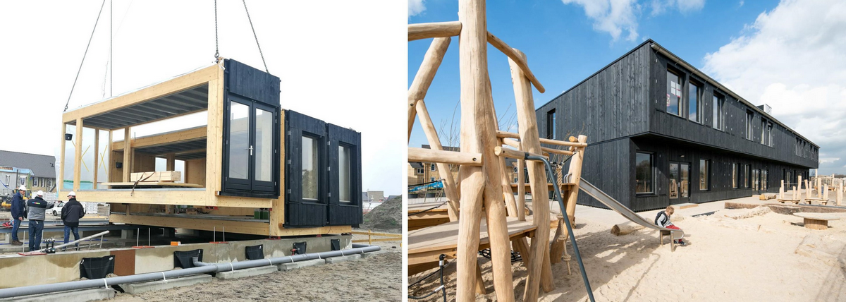 L’agence SeARCH a développé deux formules de boîtes en bois d’ingénierie. 1- Produits par De Groot Vroomshoop & Edgertdeboer, des modules à ossature aux arêtes en bois lamellé libérant les parois afin de générer de grands espaces pour l’école Klein à Amsterdam :